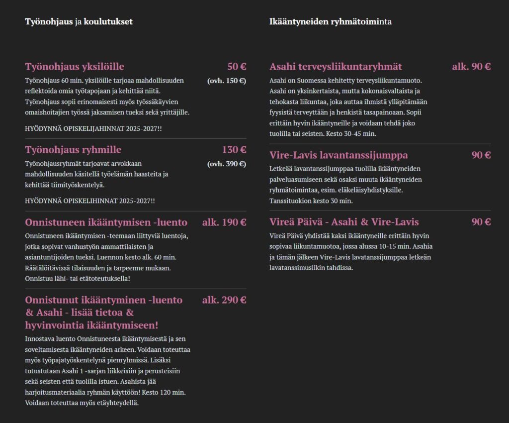 Tässä Työn Sydämen palvelut ja hinnasto.